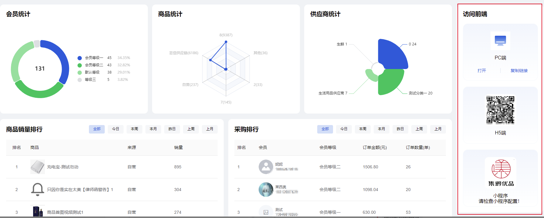 2、展示会员统计(根据会员等级数量统计),商品统计,供应商统计信息,商品销量排行和采购排行(可筛选今日,本周,本月,昨日,上周,上月)数据