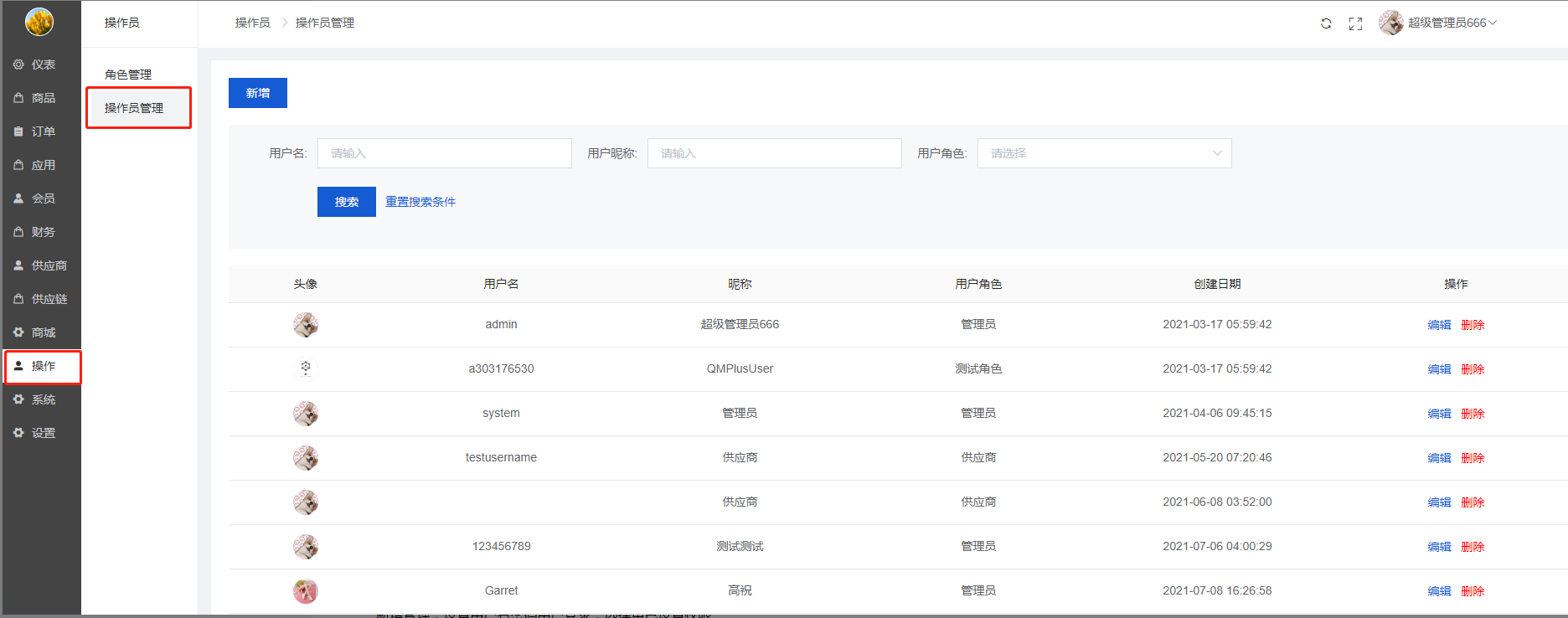 可进行列表筛选:用户名,用户昵称,用户角色