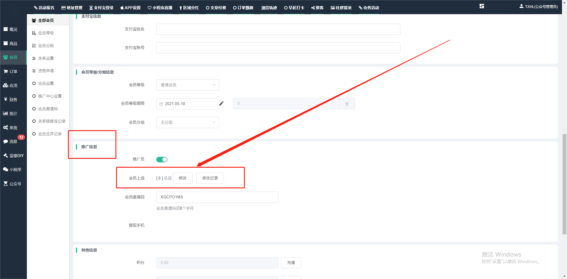 目录 搜索 展开 一、前期准备资料二、数字乡村码-上线操作指南1、服务号的申请流程及认证2、申请小程序流程3、开放平台绑定小程序和公众号三、数字乡村码-系统操作数字乡村码系统管理-概况数字乡村码-商品管理1、发布商品2、商品列表3、商品表单4、商品分类5、品牌管理6、配送模板7、评论管理8、优惠券管理9、商品标签10、退货地址设置11、满额优惠12、批量操作13、配送方式14、基础设置15、商品隐藏四、数字乡村码-会员管理1、全部会员2、会员等级3、会员分组4、资格申请5、会员设置6、推广中心设置7、会员邀请码8、会员关系链修改关系链修改记录9、会员合并记录10、账号注销管理11、会员设置中心五、数字乡村码-订单管理1、订单管理列表2、订单处理流程3、订单状态4、订单修改价格5、订单退款退货6、多包裹发货7、批量发货订单操作步骤8、催发货订单9、物流查询六、数字乡村码-财务管理1、余额设置2、会员余额3、充值记录4、转让记录5、余额明细6、收入明细7、提现设置8、提现统计9、积分管理10、转账审核11、收益广告12、批量充值七、数字乡村码-系统管理1、商城入口2、商城设置①、商城设置②、订单设置③、物流查询④、短信⑤、联系方式⑥、分类⑦、优惠券⑧、分享⑨、幻灯片⑩、广告位⑫、地图设置3、交易设置4、微信模板消息自定义消息模板(新版)自定义消息模板(旧版)小程序消息模板公众号模板消息变更公告5、语言设置6、权限管理7、多媒体管理八、数字乡村码-消息管理九、数字乡村码-应用管理十、数字乡村码系统-数据统计十一、数字乡村码-页面装修DIY1、模板管理2、店铺页面3、顶部导航4、底部导航5、DIY模板市场6、首屏广告7、基础设置8、装修DIY尺寸建议十二、供应商功能插件操作指南1、供应商2、门店-收银台门店申请和使用步骤门店管理①、门店-收银台 营销设置②、门店-收银台 分润设置门店分类门店申请门店审核门店商品门店商品订单收银台订单数据统计核销员基础设置默认设置门店装修3、微社区4、会务活动十三、营销插件操作指南活动报名提货卡新人奖微店问卷调查积分视频分享1、视频分享基础设置2、视频分享发现管理3、视频分享分类管理4、视频分享评论管理5、视频分享分红记录6、视频分享短视频中心每日红包幸运大抽奖签到优惠券二维码任务奖励优惠劵文章音频文章付费文章限时购新海报拓客卡操作流程积分活动素材中心视频红包十四、入驻门店应用类1、门店预约2、附近商品3、门店定位设置4、门店控制5、门店满额包邮6、门店满额减7、导入商品8、门店搜索9、门店股东10、核销券11、多门店核销1、商城后台设置2、前端功能演示十五、常见问题1、后台登录密码修改流程2、会员-余额,积分,后台如何进行充值与扣除3、如何修改上下级关系4、一种万能的获取商城小程序路径的方法 暂无相关搜索结果! 阅读次数:1494 本文档使用 模王系统 发布 3、如何修改上下级关系 如何修改上下级关系一.如何修改上下级关系?1.会员-全部会员-可以通过搜索用户的独立ID,或者用户微信昵称,找到此会员,然后点击右边的(操作)2.再点击会员详情。3.滑到下面,有个推广信息-会员上线,点击修改4.输入上级的ID号,点击搜索,出来此上级会员后点击选择。5.滑到最下面,一定要点击提交按钮。文档更新时间: 2024-01-05 14:50 作者:链上旅行