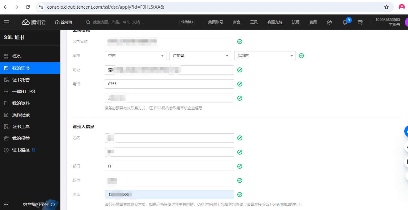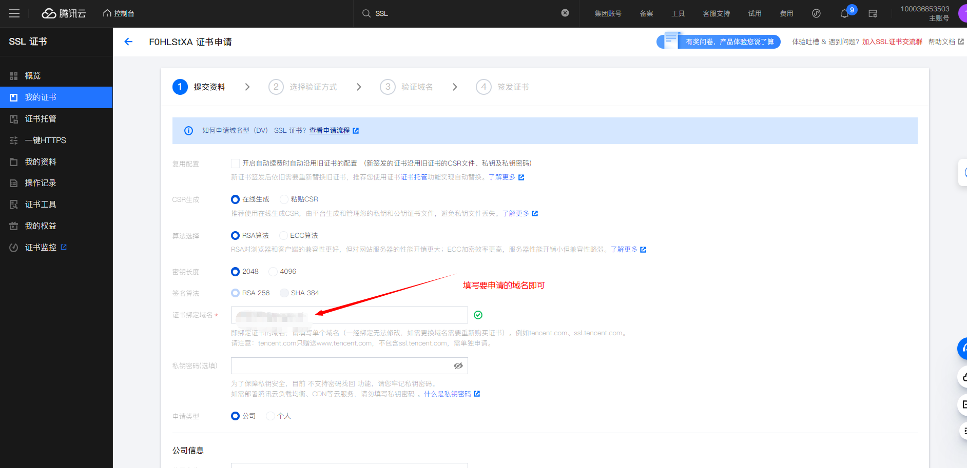 填写申请资料:填写需要绑定的域名;及公司信息,管理员信息。