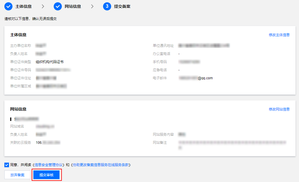 - 在 “备案订单” 预览信息页面中,请仔细核对您的备案信息,确认无误后,阅读和勾选同意,并阅读《信息安全管理协议》和《协助更改备案信息服务在线服务条款》,并单击提交审核。如下图所示: