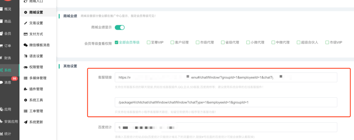 H5端设置客服链接设置填写H5链接;